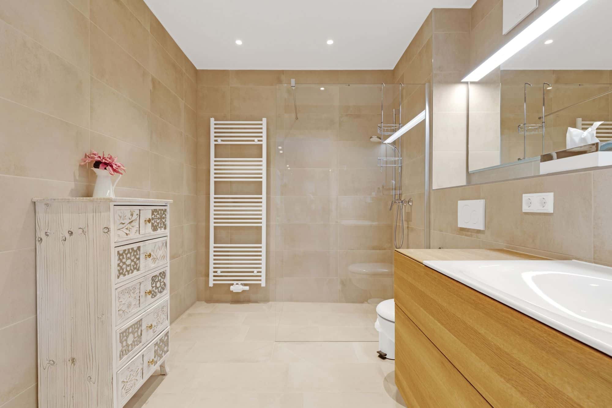 großes ansprechendes Badezimmer mit bodentiefer Dusche, Waschbecken mit hochwertigem Unterschrank, WC und großem Badspiegel über dem Waschbecken