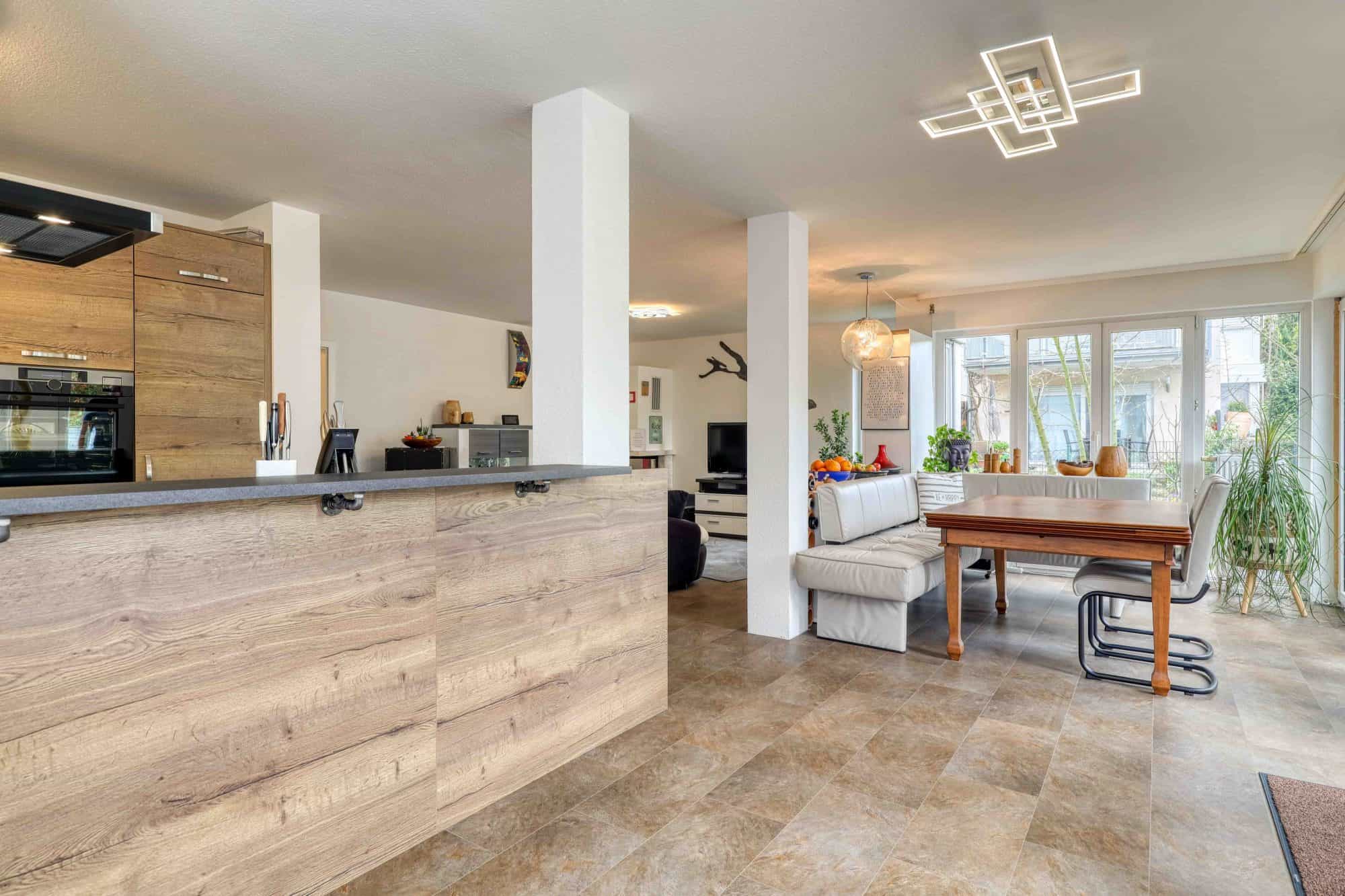 Die durchgängige Fensterfront an der Terrassenseite verwandelt den großzügigen Wohn-Ess-Bereich in eine lichtdurchflutete Wohlfühloase mit Blick ins Grüne. Zusätzliche Lichtquellen bieten die Eckfenster im Wohnbereich und in der Küche.