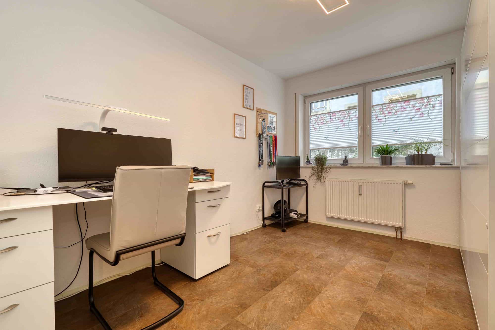 Die freundliche und gut geschnittene Wohnung verfügt über eine Gesamtwohnfläche von 93,63 m² und ist aufgeteilt in ein großzügiges Wohnzimmer, einen lichtdurchfluteten Essbereich, eine offene Küche, ein Schlafzimmer, ein Kinder-/Arbeitszimmer, ein modernes Tageslichtbad mit begehbarer offener Dusche, einem Garderobe mit Einbauschränken und einem geräumigen Flur.